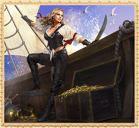 Bir korsan gemisinin güvertesinde duran cesur bir deniz korsanı, yeni savaşları ve maceraları öngörerek mesafeye dikkat çekiyor.
